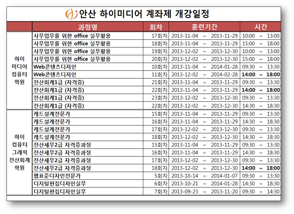 [내일배움카드] 2013년 11월, 12월 개강 일자